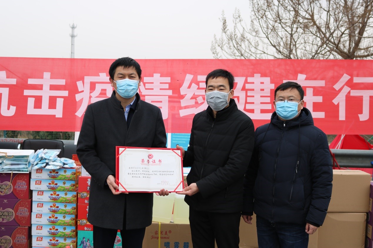 鄭州市政協(xié)委員、河南省園林綠化協(xié)會副會長、綠建景觀設(shè)計工程有限公司董事長王建發(fā)先生通過滎陽慈善總會了解到滎陽市防疫物資緊缺后,積極發(fā)動一切資源,籌集防疫緊缺物資。2月14日,王建發(fā)先生帶領(lǐng)公司部分高管,分別慰問了戰(zhàn)斗在疫情一線的滎陽高速收費站執(zhí)勤人員,滎陽高村鄉(xiāng)李山新村村委會執(zhí)勤人員等,為他們帶去了價值16284元的防疫急需物資和生活保障物資,其中醫(yī)用口罩1200副、消毒液40箱(160桶)、消毒液噴壺50個、方便面60箱、火腿腸40箱。積極履行企業(yè)社會責任,為疫情防控出一份力。