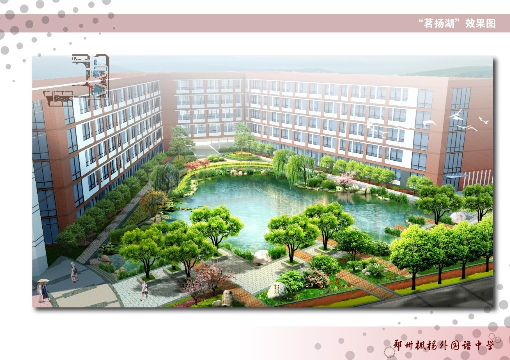 本項目位于鄭州高新區垂柳路以西、引黃干渠、月季街以南、池北路以北區域,依據對建筑布局和場地條件分析及設計理念的綜合考慮,形成“兩軸、兩帶、四區、八景”為特色的景觀設計框架,營造出校園鮮明的精神風貌及獨特的外在形象。