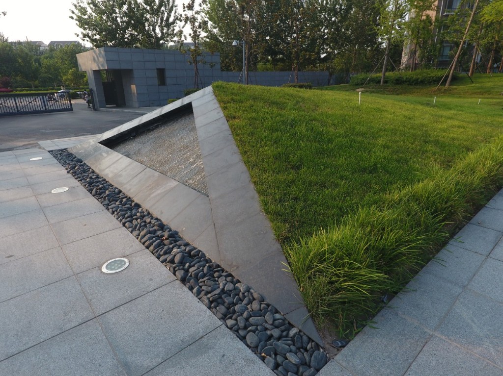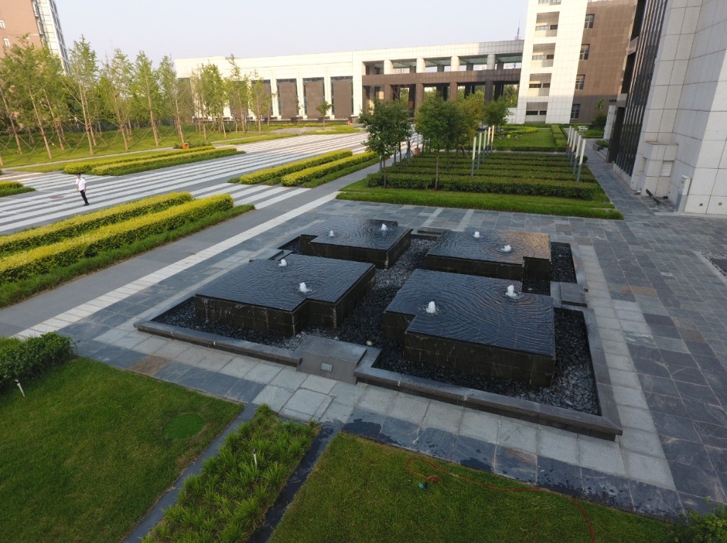 場(chǎng)地采用幾何式的線條設(shè)計(jì),利用植物、水景等景觀元素劃分出不同的功能空間,簡(jiǎn)潔明快,充滿現(xiàn)代氣息。道路結(jié)合植物做到人車分流,保障行人的安全。將商務(wù)區(qū)與其他樓連接在一起,創(chuàng)造出令人舒適的小尺度空間,鞏固了人與人之間的親密感受。大小空間的連接處由水景作為過(guò)渡,形成視覺(jué)焦點(diǎn),豐富空間層次。