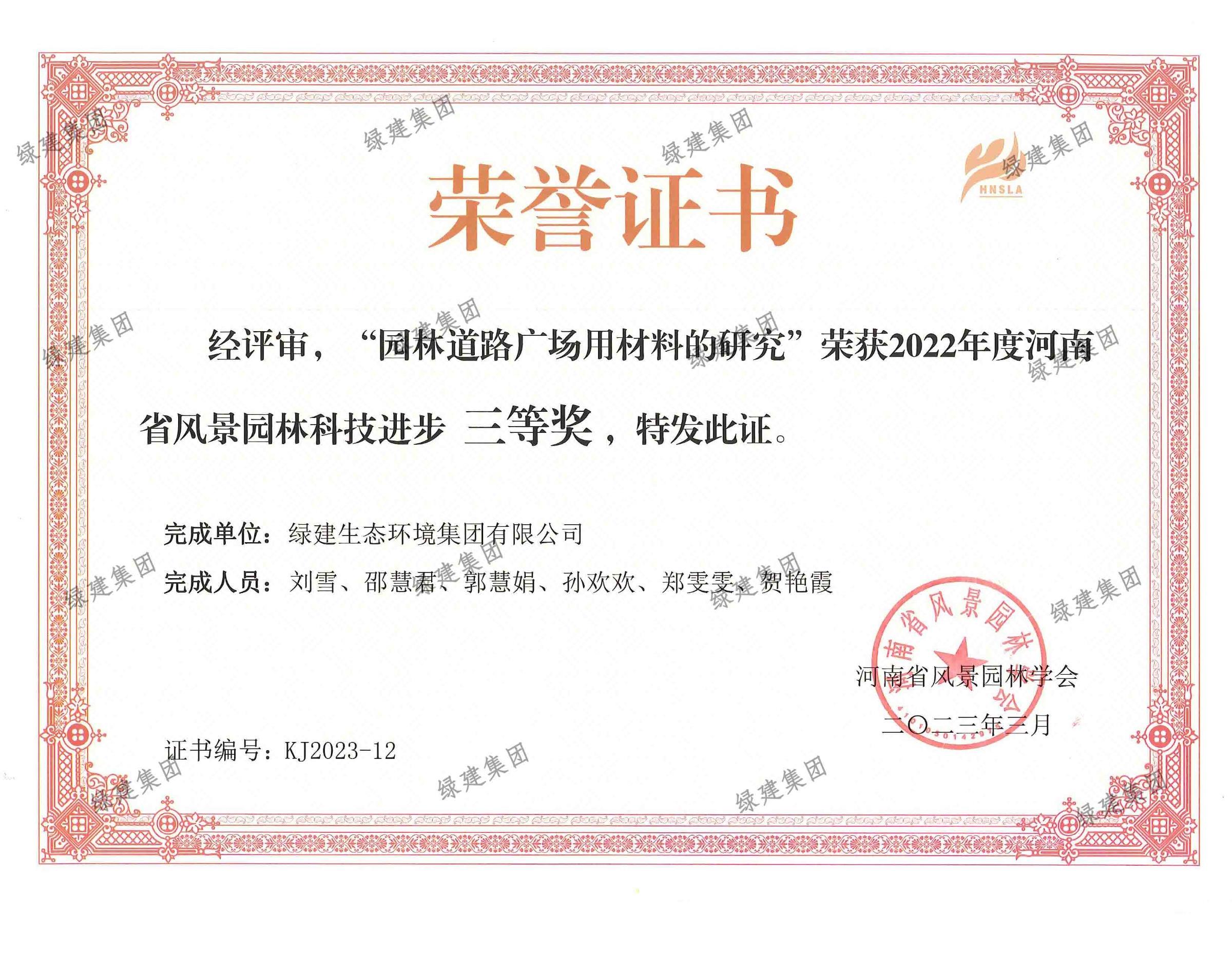 2023年度河南省風景園林科技進步獎三等獎