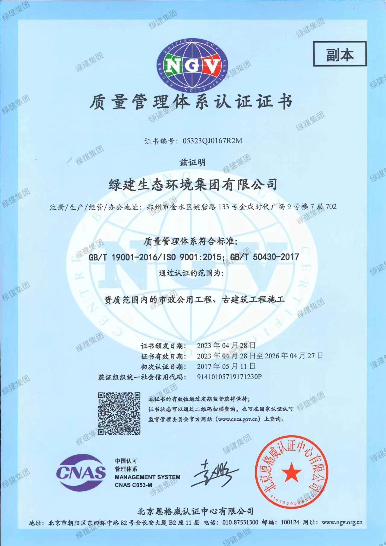 質量管理體系認證證書(施工)